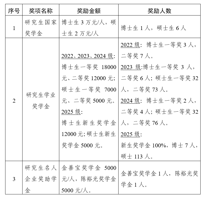 本次评选奖项为:研究生学业奖学金、研究生国家奖学金以及研究生校级名人企业奖助学金(包括金善宝奖学金、陈裕光奖学金)。
