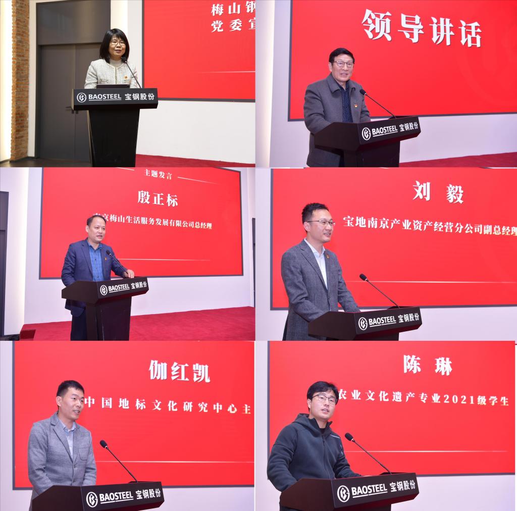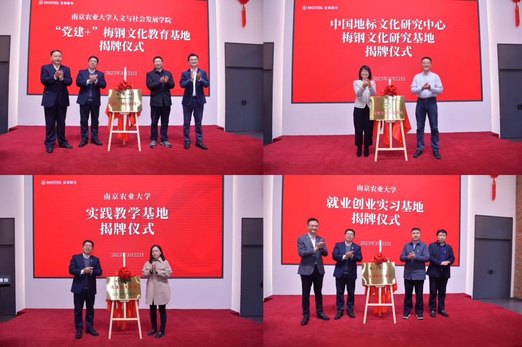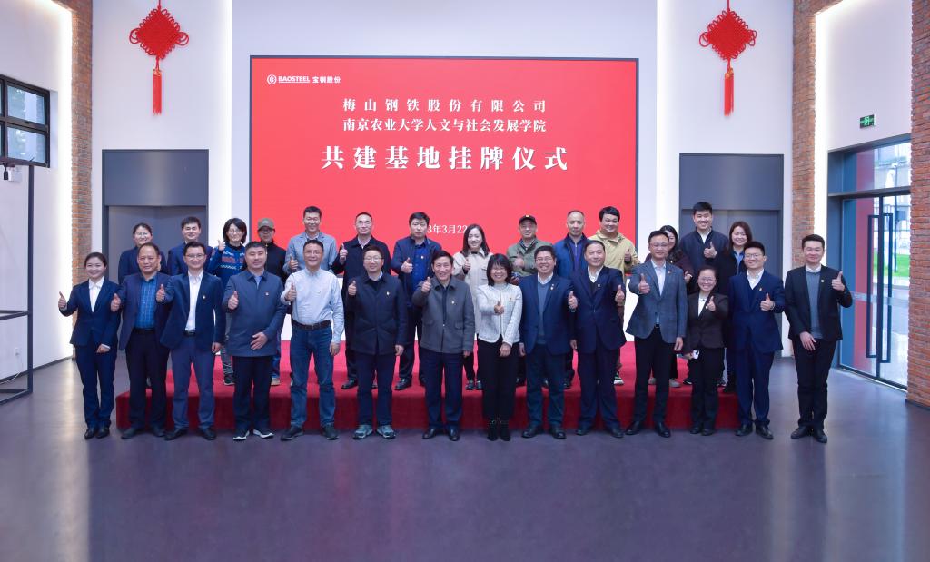 与上海梅山钢铁股份有限公司举行共建基地挂牌仪式。梅钢公司工会主席、企业文化(宣传)部部长朱梅,梅钢公司人力资源(组织)部副部长、统战部部长苏潜,梅钢公司企业文化(宣传)部副部长李在喜,雨花台区人大常委、南京梅山生活服务发展有限公司总经理殷正标,宝地南京产业资产经营分公司副总经理刘毅,正处级组织员、校党委组织部副部长熊富强,党委组织部副部长许承保,学院党委书记李日葵、院长卢勇、副书记冯绪猛、副院长戚晓明、科学技术史学科点点长盛邦跃,党委宣传部校报编辑部主任赵烨烨,党委组织部正科级组织员何旭出席挂牌仪式,学院教师代表和文化遗产专业2021级学生参与本次活动。仪式由李在喜主持。