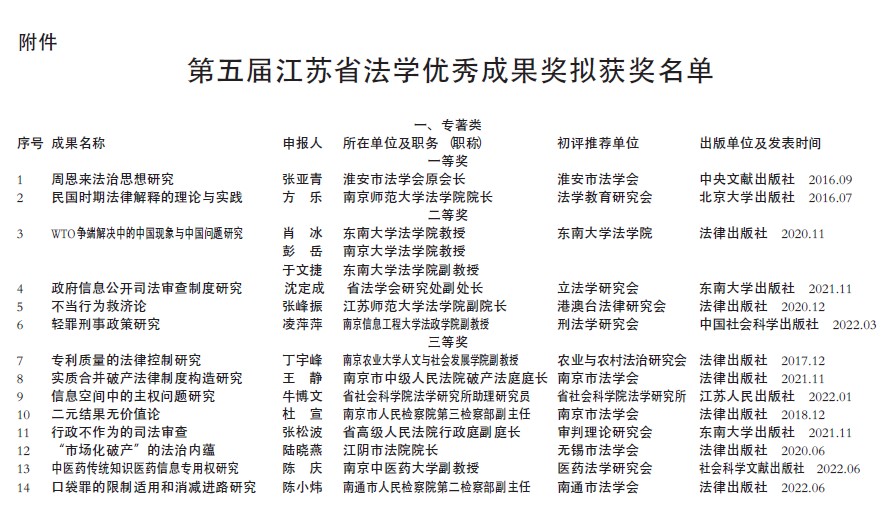 2022年10月20日,江苏省法学会公示了第五届“江苏省法学会优秀成果奖”评选结果。该奖经个人申报、单位党组织同意、初评单位推荐、终评委员会专家评审、公示等程序,最终确定获奖成果仅35部(篇),其中专著14部。疯av
