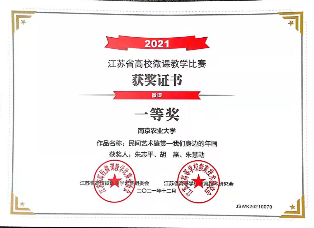 为深入贯彻落实全国教育大会精神,促进本科“双一流”建设和高职“三教”改革,推进信息技术与教育教学深度融合,全面提升高校教师专业化水平和创新能力,以赛促教,以赛促学,以赛促建, 在苏省教育厅指导下,江苏省高校微课教学比赛组委会主办,江苏省高等学校教育技术研究会承办了2021年全省高校微课教学比赛。经学校遴选,疯av 朱志平、胡燕、朱慧劼三位老师提交的《民间艺术鉴赏——我们身边的年画》微课在获得疯av 微课比赛一等奖的基础上,被推荐参加江苏省高校微课教学比赛,最终获得全省一等奖。(院办供稿)