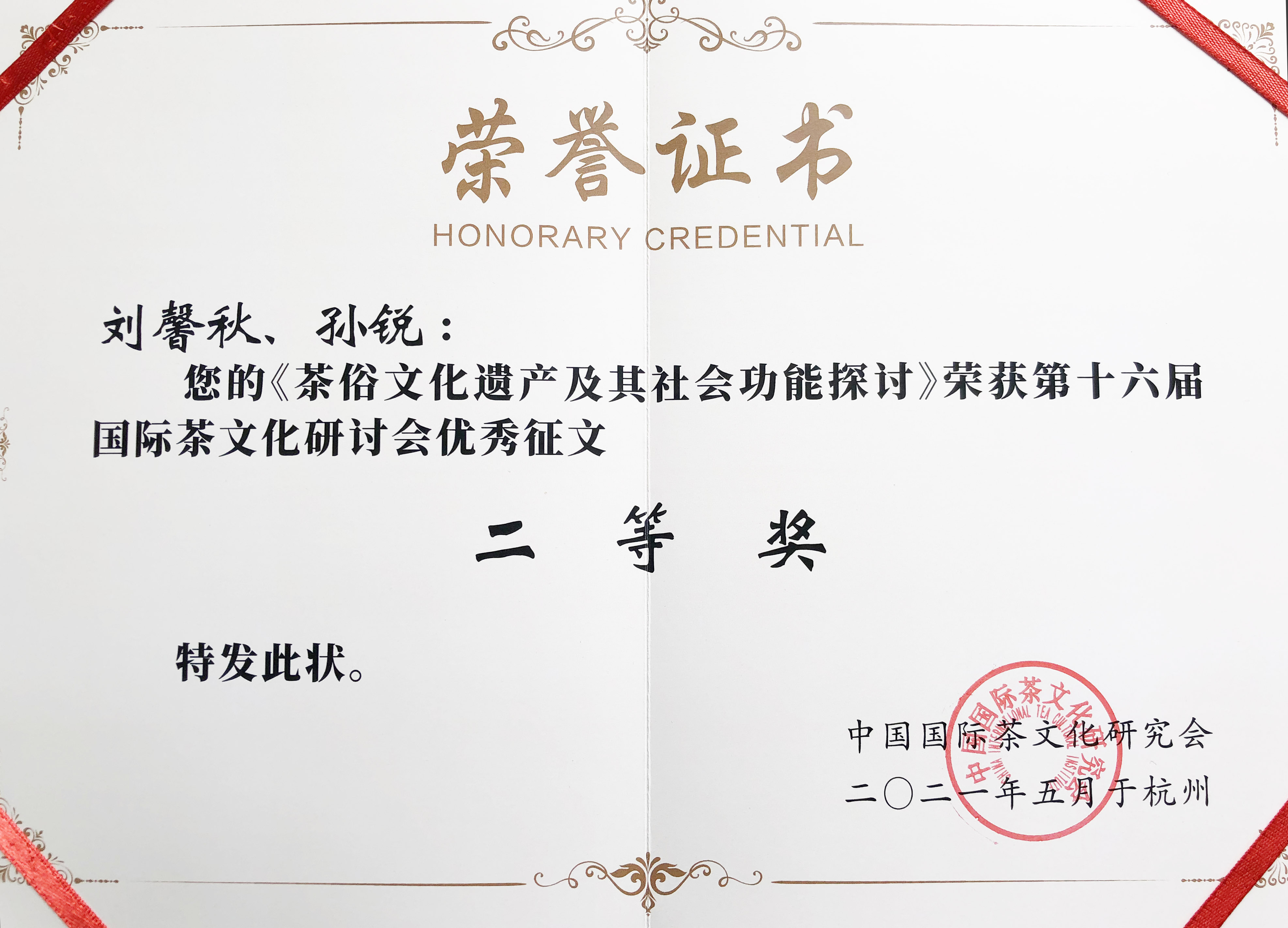 科技史系副教授刘馨秋、硕士研究生孙锐合作的论文《茶俗文化遗产及其社会功能探讨》,获得第十六届国际茶文化研讨会优秀征文二等奖。据悉,本次论坛收到投稿246篇,经专家组两轮审评,评选出一等奖2篇、二等奖6篇、三等奖12篇、特别奖3篇。