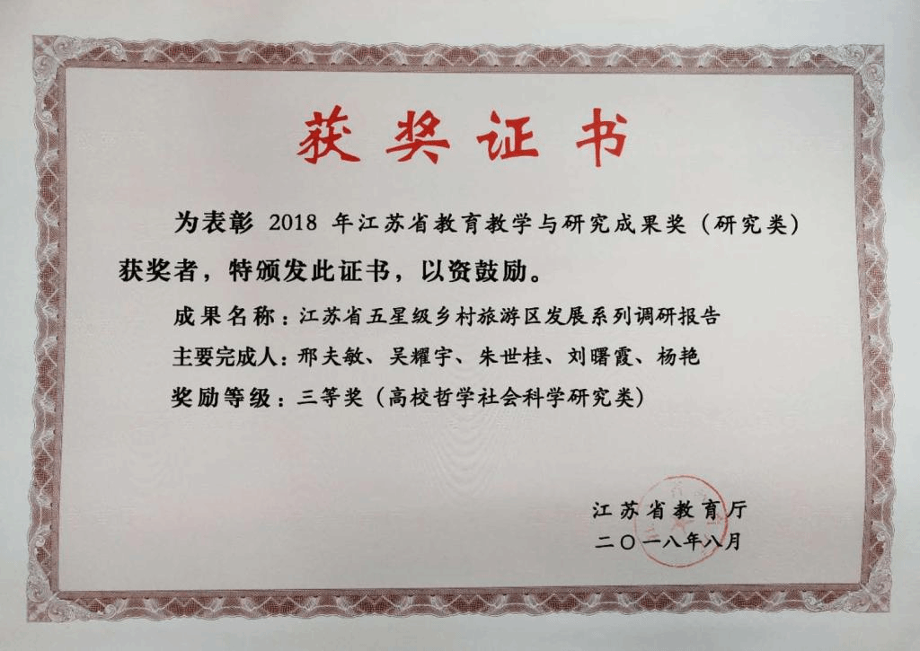 、南京林业大学等多家科教单位共同完成的,主要围绕江苏省乡村旅游区星级评定与综合评估,调研总结了五星级乡村旅游区发展的总体情况和创新实践,对贯彻实施乡村振兴发展战略、发挥乡村旅游富民惠民功能等有重要积极意义。据了解江苏省教育教学与研究成果奖(研究类)分为高校自然科学研究类、高校哲学社会科学研究类、教育研究类三个类别,每两年评选一次。2018年江苏省教育教学与研究成果奖是在全省学校和个人申报、所在市或高校推荐公示的基础上,经江苏省教育科学研究成果奖评委会认真评选、公示、省教育厅审定后公布的,全省共有高校哲学社会科学研究类300项成果获2018年江苏省教育教学与研究成果奖(研究类),其中一等奖20项、二等奖80项、三等奖200项。