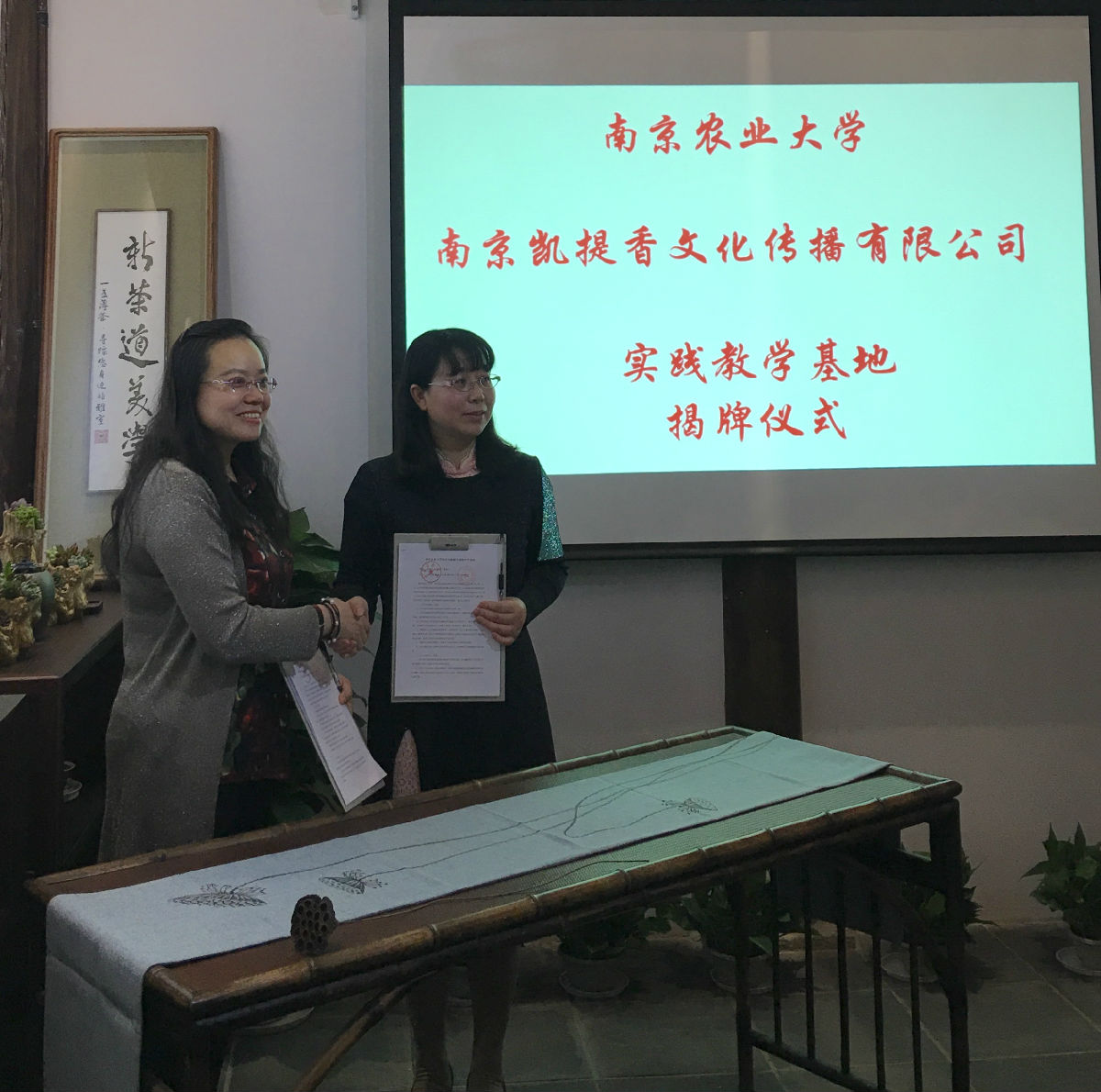 4月11日,人文学院与南京凯提香文化传播公司共建实践教学基地揭牌仪式在南京老门东中营42号隆重举行。学院党委书记朱世桂教授、副院长姚兆余教授、院办尤兰芳主任、文化管理系支部书记谭放老师、文化管理系陈叶老师、旅游管理系支部书记黄颖老师、艺术系系主任周辉国副教授、园艺学院茶学系系主任陈暄副教授,与南京凯提香文化传播公司陈明华董事长、孙冬明总经理、江苏省文化艺术研究院彭毅主任、南京市非物质文化遗产保护中心万宝宁主任共同出席了仪式。
