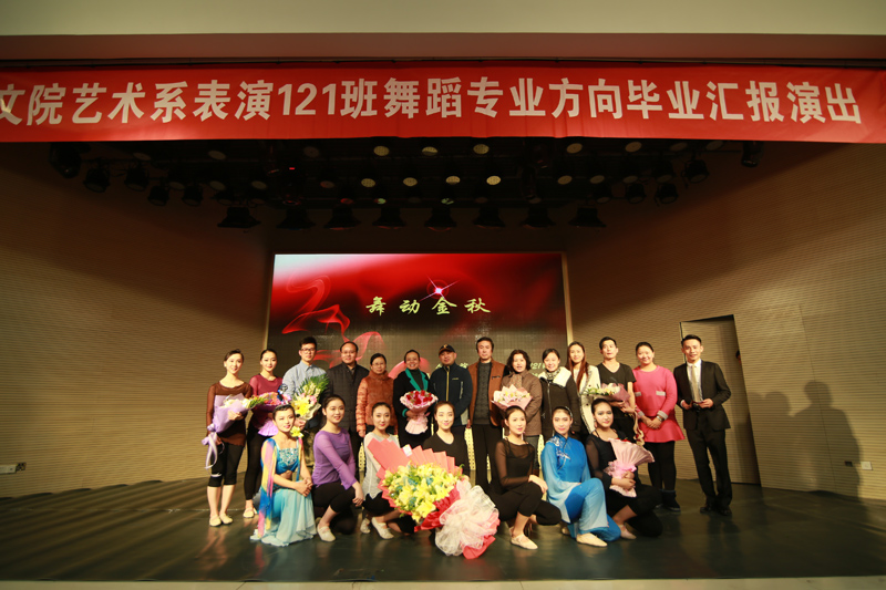 学报副主编宋雪飞、公共艺术教育中心办公室主任朱志平、校团委实践部部长贾媛媛、校团委校园文化部部长朱媛媛、外国语学院侯广旭教授、校新农村发展学院综合科科长严谨、舞蹈专业方向历届毕业校友、本届毕业生家长代表以及学校舞蹈爱好者教师代表。 晚会以江南风韵的集体舞《风荷语笠》拉开序幕,此舞蹈曾荣获江苏省第四届大学生艺术展演舞蹈比赛专业组一等奖,姑娘们纤柔妙曼的舞韵给观众留下了美好的江南情韵。赵思杨同学表演的鄂温克族舞蹈《鄂温克的拉玛湖》,让观众体会到鄂温克族人对拉玛湖深深的思念与感恩之情。赵天羽同学表演的《一滴水》,用那天真童趣而又灵巧的舞姿,高难度的舞蹈技巧表现出缺水山区孩子对雨水的渴望,这个舞蹈已入围2015年江苏省“莲花杯”的决赛,这是江苏省最专业、最高级别的舞蹈赛事,12月将奔赴无锡参加决赛。6位同学表演的舞蹈技巧组合将晚会推向高潮,舞者们个个技术精湛,身怀绝技,现场爆以热烈的掌声、喝彩声、欢呼声为他们贺赞。胡启梦同学表演的傣族舞《鱼儿》,以灵动的身姿模仿了水中鱼儿漫游嬉戏的动态,舞者俏皮的表演紧紧抓住了观众的目光。徐文任同学表演的蒙古族舞蹈《草原骄子》,表达了草原人对草原的热爱。晚会在群舞《时间都去哪了》现代舞中落下了帷幕。胡启梦、赵思扬、赵天羽、徐文任四位同学,用真情给观众展示了大学四年来付出的努力和老师严格要求的成果,他们用舞蹈感念师恩,感念这留下无数欢笑和泪水的母校。晚会结束,观众们久久不舍离去,领导们充分肯定同学们四年来的学习成果,毕业生家长们对教学效果给予了热情的赞扬,毕业校友夸赞观摩舞蹈毕业汇报获得了美的享受。最后,领导们上台与演职人员拍照留念。人文学院表演121班舞蹈专业方向汇报专场圆满收官! 四年的学习和磨练将他们塑造得更有活力,更具社会竞争力。这次专业汇报带给他们的不仅仅是掌声、喝彩声、欢呼声,更是母校的寄语,祝他们明天会更好!