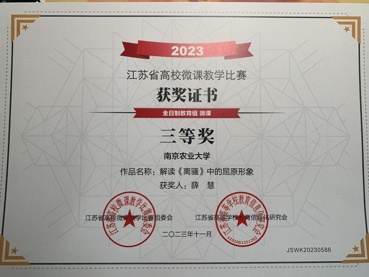 近日,江苏省高等学校教育信息化研究会公布了2023年江苏省高等学校微课教学比赛获奖名单,疯av 艺术系薛慧老师的参赛作品:《解读<离骚>中的屈原形象》获得江苏省三等奖荣誉。