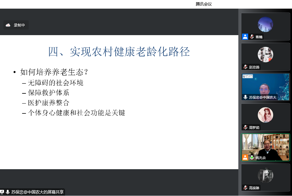 百廿校庆学术论坛顺利举行,论坛采用腾讯会议的形式。中国农业大学经济管理学院教授苏保忠应邀作了题为“新时期农村健康老龄化基本问题探讨”的学术报告。本次论坛由学院院长卢勇教授主持,农村老年保障研究中心主任姚兆余教授为与谈人,学院教师、各专业研究生40余人在线上聆听了讲座。