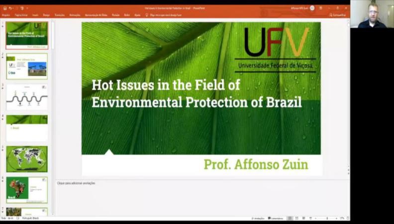 阿方森·祖尼的发言主题为“巴西环境保护中的热点问题”。他介绍了巴西自然环境和土地使用的多样性,通过图片详细阐述巴西的生物群区和环境保护问题,并列出多方面的解决方案;同时也指出仍有国际合作等方面问题亟待解决。