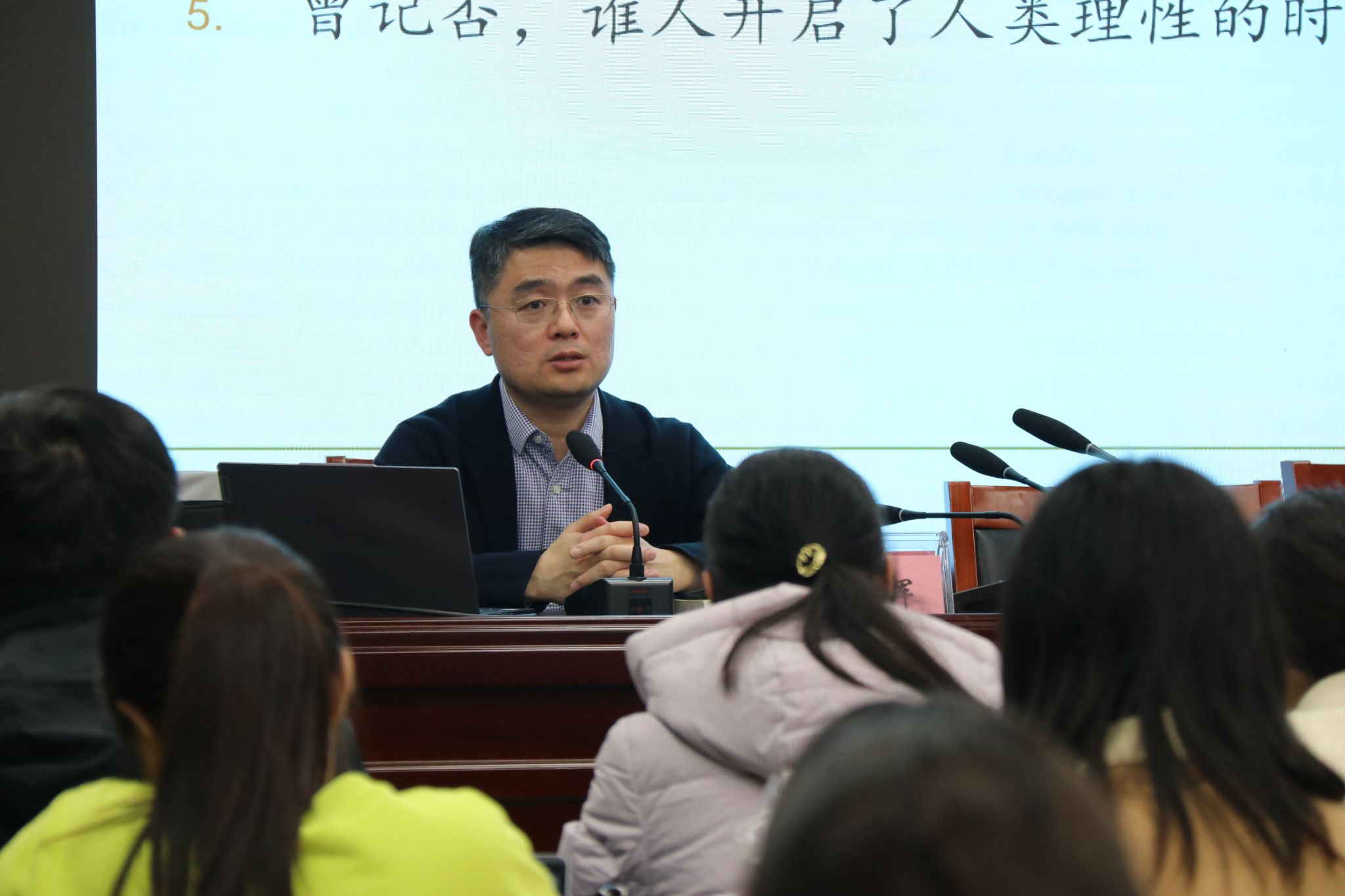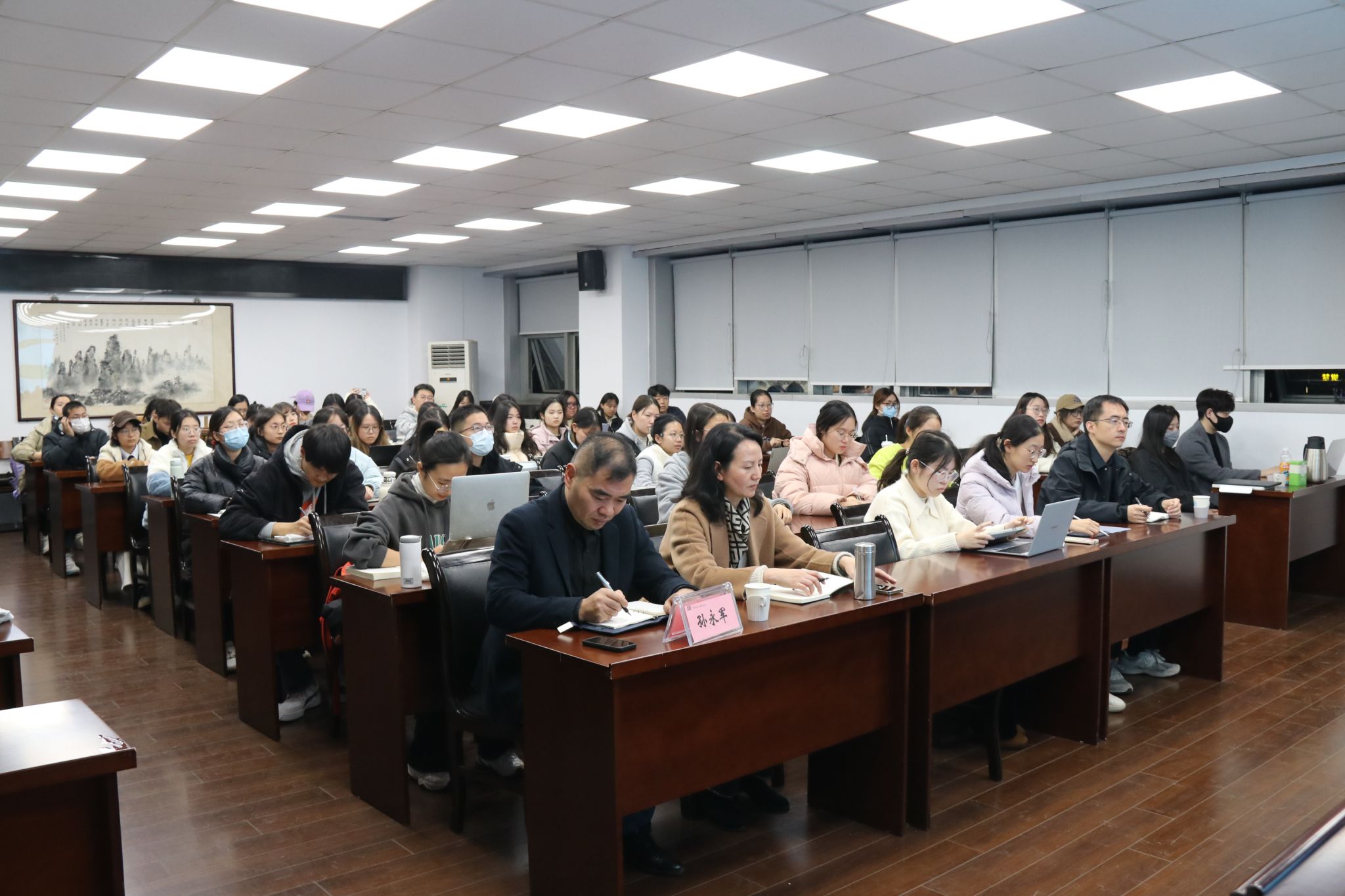 师生近百人在逸夫楼6047会议室聆听了讲座。讲座由疯av