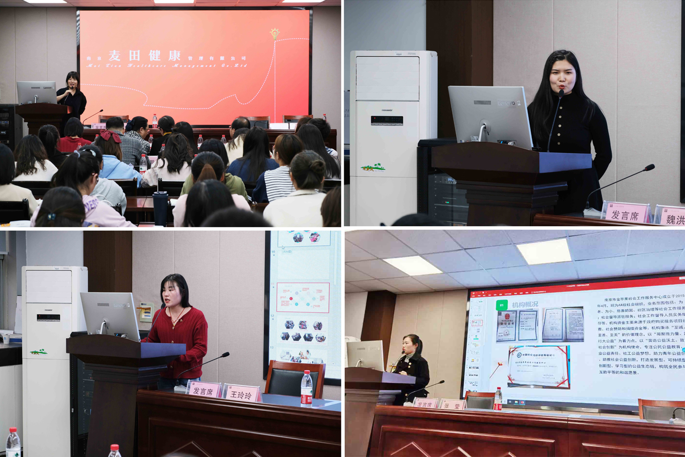 随后,11家机构负责人或代表分别介绍了机构概况和目前开展的服务项目,并对研究生实习工作提出了期望和要求。其中,江苏省民政厅机关党委专职副书记、江苏省养老服务指导中心主任、江苏省老年公寓院长孙燕表示,江苏省老年公寓作为省级养老服务平台,长期以来秉持个性化服务的理念,拥有经验丰富的养老服务专家,能够为南农社工实习生提供足够的成长空间。南京市心贴心老年人服务中心副主任张莲娣介绍了长期以来与南农MSW合作培养社会工作研究生的情况,表达了对实习生的希冀和期待,希望研究生在实习中逐渐掌握实务方法和技能,逐步成为能够承担项目服务的社工人才。悦民社会工作服务中心总干事徐晓辉介绍了该机构多年来开展青少年健康成长服务工作的过程和成就,充分肯定了疯av