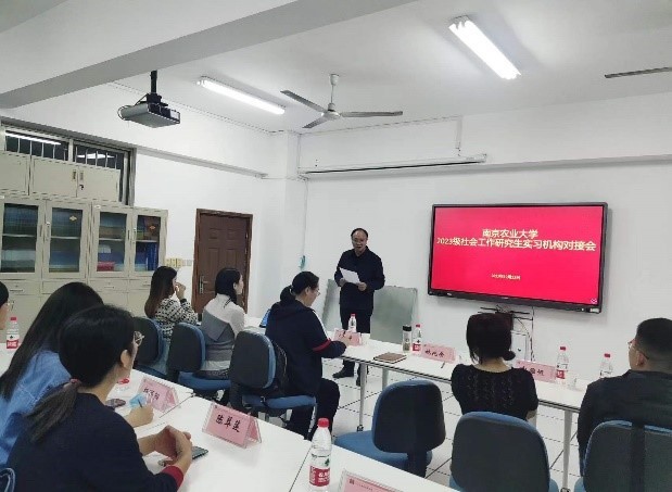 MSW教育中心举行2023级社会工作研究生实习机构对接会。MSW教育中心主任姚兆余、秘书朱慧劼、晓平社会工作发展中心主任刘晓平、悦民社会工作服务中心主任陈翠萍、南京养老服务志愿者联合会副秘书长汪晓稳、江苏智联康健科技有限公司副总经理赵雅恒、心苑社会工作服务中心总干事夏浩文、乐众社会工作服务中心秘书长张令萍、心桥社会工作服务中心项目主管吴朝帅、金苹果社会工作服务中心人事主管傅晓、以及2023级社会工作研究生参加了会议。会议由姚兆余主持。
