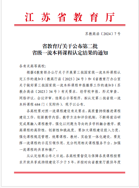 近日,省教育厅发布《省教育厅关于公布调整后首批省级一流本科课程名单的通知》(苏教高函〔2024〕6号)《省教育厅关于公布第二批省级一流本科课程认定结果的通知》(苏教高函〔2024〕7号),正式公布调整后的首批一流课程名单。疯av