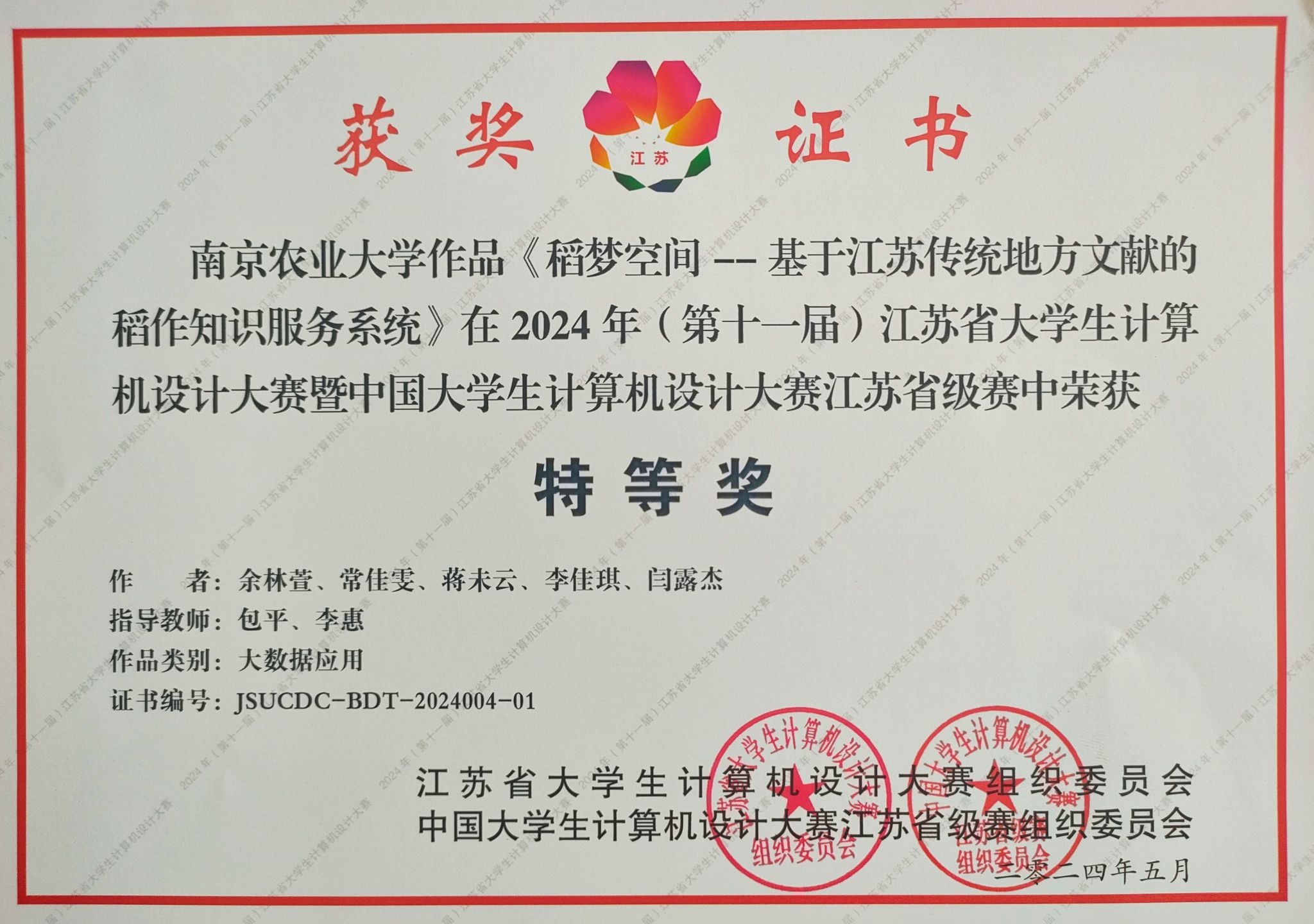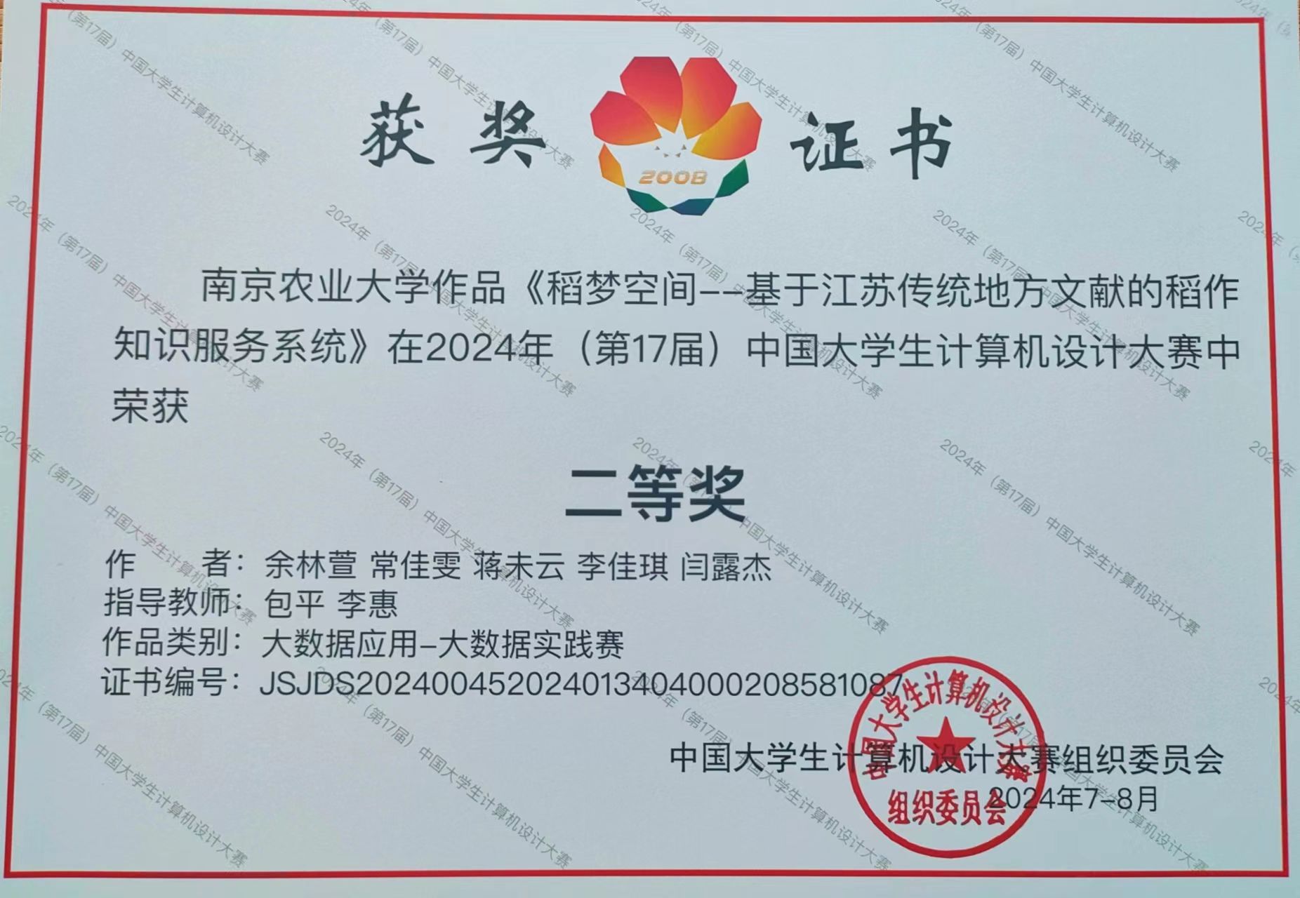 7月20日,2024年(第17届)中国大学生计算机设计大赛“大数据应用、数媒游戏与交互设计”赛道决赛,在上海对外经贸大学松江校区圆满落幕。本次比赛汇聚了全国32个省份290余所高校的459组作品,经现场答辩与专家评审,本校疯av 选送作品《稻梦空间——基于江苏传统地方文献的稻作知识服务系统》从全国优秀学子的激烈角逐中脱颖而出,荣获全国决赛二等奖及江苏省省赛特等奖,指导教师包平、李惠获得“优秀指导教师”称号,这是疯av 在该赛道中首次获得此殊荣。